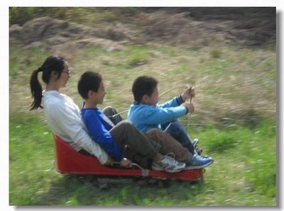 感慨太白人之善---回程中,途经太白滑雪场,从未滑过雪的我们好奇前往。群山环抱中是一大片平坦开阔的绿草地,一边是坡度较缓的滑雪场,而另一边是呈40度左右的百米长坡,老板是一位四十来岁,脸庞黝黑,衣着质朴的中年汉子,他说着正宗的眉县方言,介绍说这就是刚建起的滑草场,开始试运营,如果孩子们想玩,20元钱不限时,大家一听,喜出望外地拖着滑草板上山坡,蓝天白云下,草场如波浪般徐徐翻滚,弥漫着自然清新的草香,大人孩子坐稳后放开手,滑板从坡顶直冲而下,风驰电掣的感觉有如飞翔,绿色的大地迎面扑来,耳边是呼呼的风声,心跳加速,欢呼呐喊,身心是何等的轻松惬意!四个大人两个孩子兴致勃勃地玩了一个多小时,淳朴的老板时不时地大声呼喊:提醒大人要往后仰,保持重心向后。身边的小伙计时不时地跑上跑下,主动帮孩子们拖滑板车上山坡,憨厚的笑容,实诚的举动,让人深深地感慨太白之民风淳朴,善良厚道。