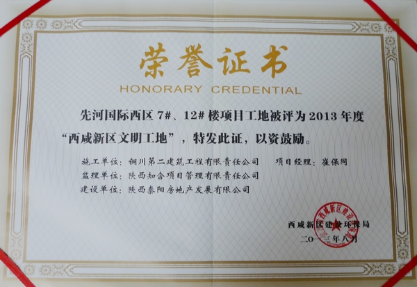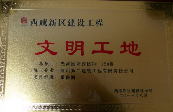 先河国际西区于2011年3月11日正式动工,两年多以来项目三位股东及公司领导的严格要求,全体员工共同的不懈努力,我项目于今年8月26日已圆满完成1#、6#楼的交房工作。项目领导及工程部上下加班加点监督7#、12#楼的主体工程完工并顺利通过验收。并且被西咸新区建设环保局授予2013年度“西咸新区文明工地”的称号。沉甸甸的奖牌,承载着多少西区人的汗水和泪水,在这一刻脸上都露出了灿烂的笑容