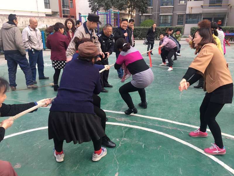 最后就是我们的拔河比赛了,现场人头攒动,气氛热烈,哨声一起,比赛队员精神抖擞、斗志昂扬、你争我夺、竞争激烈,拉拉队员们情绪高涨,呐喊助威,这热烈的气氛感染了观看的群众,他们也加入了加油的行列。参加比赛的女业主们放下了平时的风范,使尽浑身力气将绳拉向自己一方,绳中间的砝码也成了墙头草,在两边倒来倒去。拉拉队此时竭力大叫“加油”,在气势上也力求压住对方,大有火上浇油之势,一点也不比队员轻松。